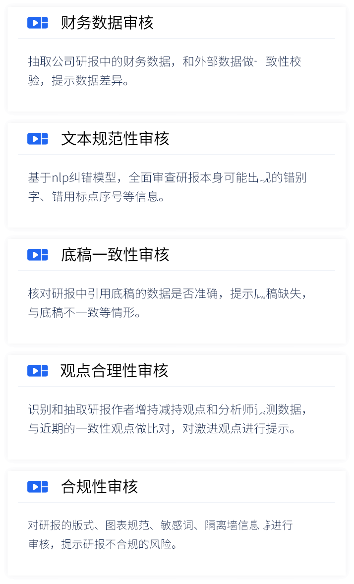 智能研报审核系统是奥林匹斯之门 pp电子奥林匹斯之门数据为券商研究所、买方研究组织等用户打造的集研报解析、抽取、审核、管理功能为一体的产品。集成OCR、NLP、机器学习等技术,对研报和底稿信息进行多方面抽取,并对研报进行数据、文本、观点等全方位的自动化审核, 同时对研报和底稿进行规范化、流程化管理,帮助用户提升工作效率,把控研报发布的时效性和合规性,全面降低出错风险。